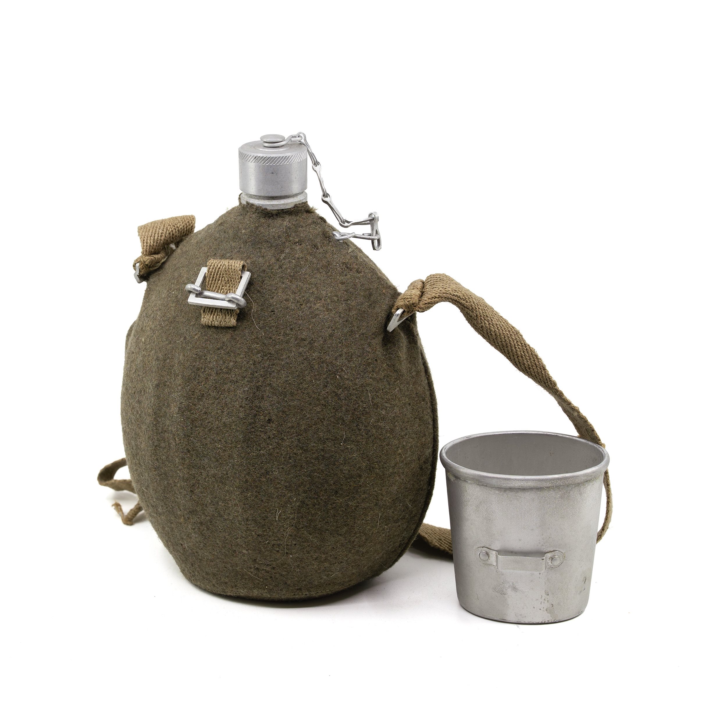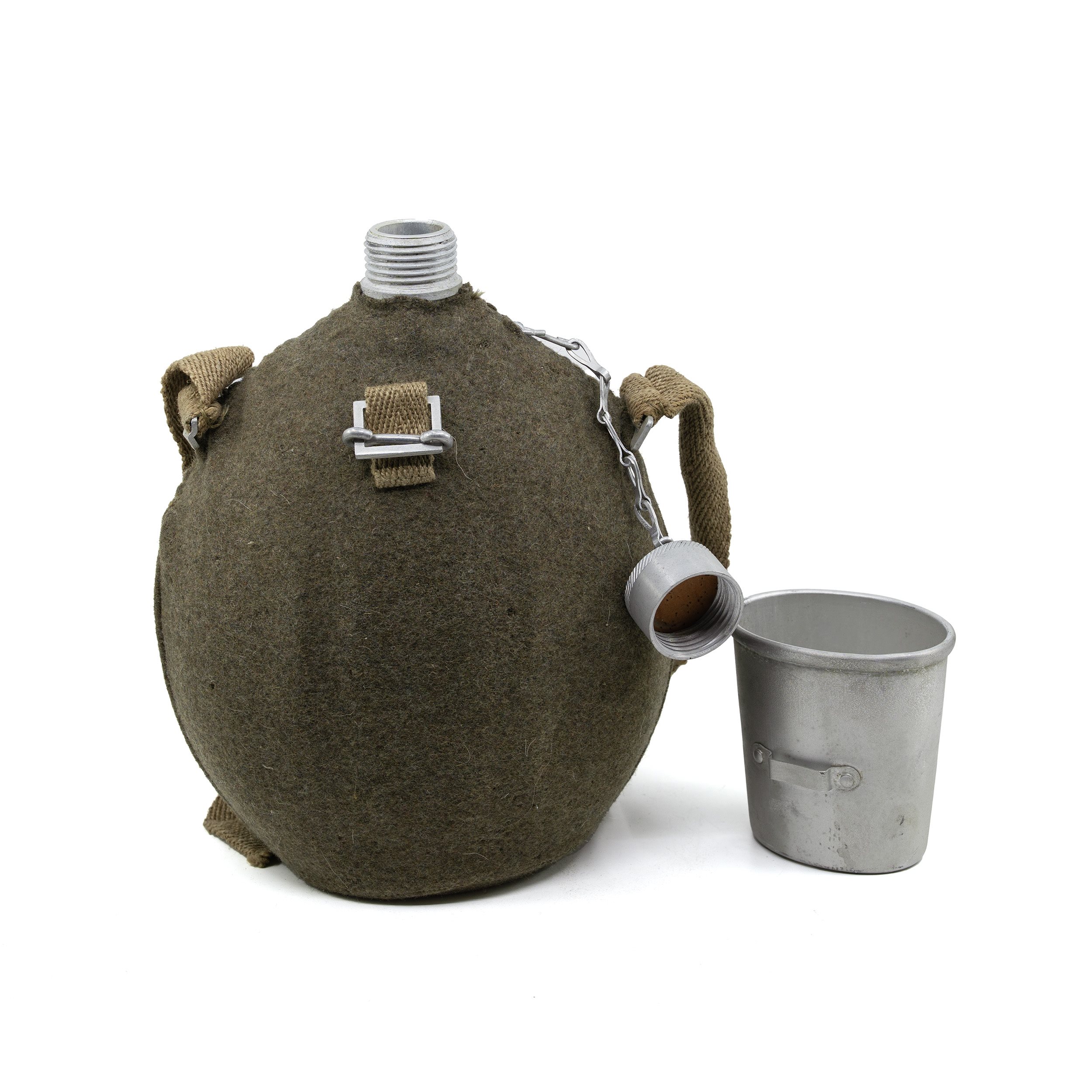 Old post-war aluminium canteen from the Italian army. Dimensions: approx. 27 x 18 x 11 cm. Long-term stored stock. Mostly new or slightly used, but shows signs of wear and tear from storage and handling. The felt cover may be moth-eaten.