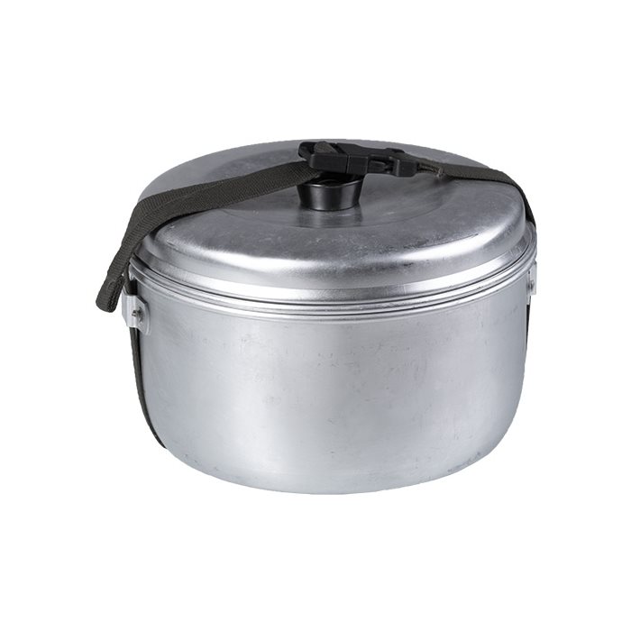 Package contents: 1.0 litre pot without handle and lid, 2.5 litre kettle without handle, 20 cm diameter plate, tongs, packing strap with metal buckle.