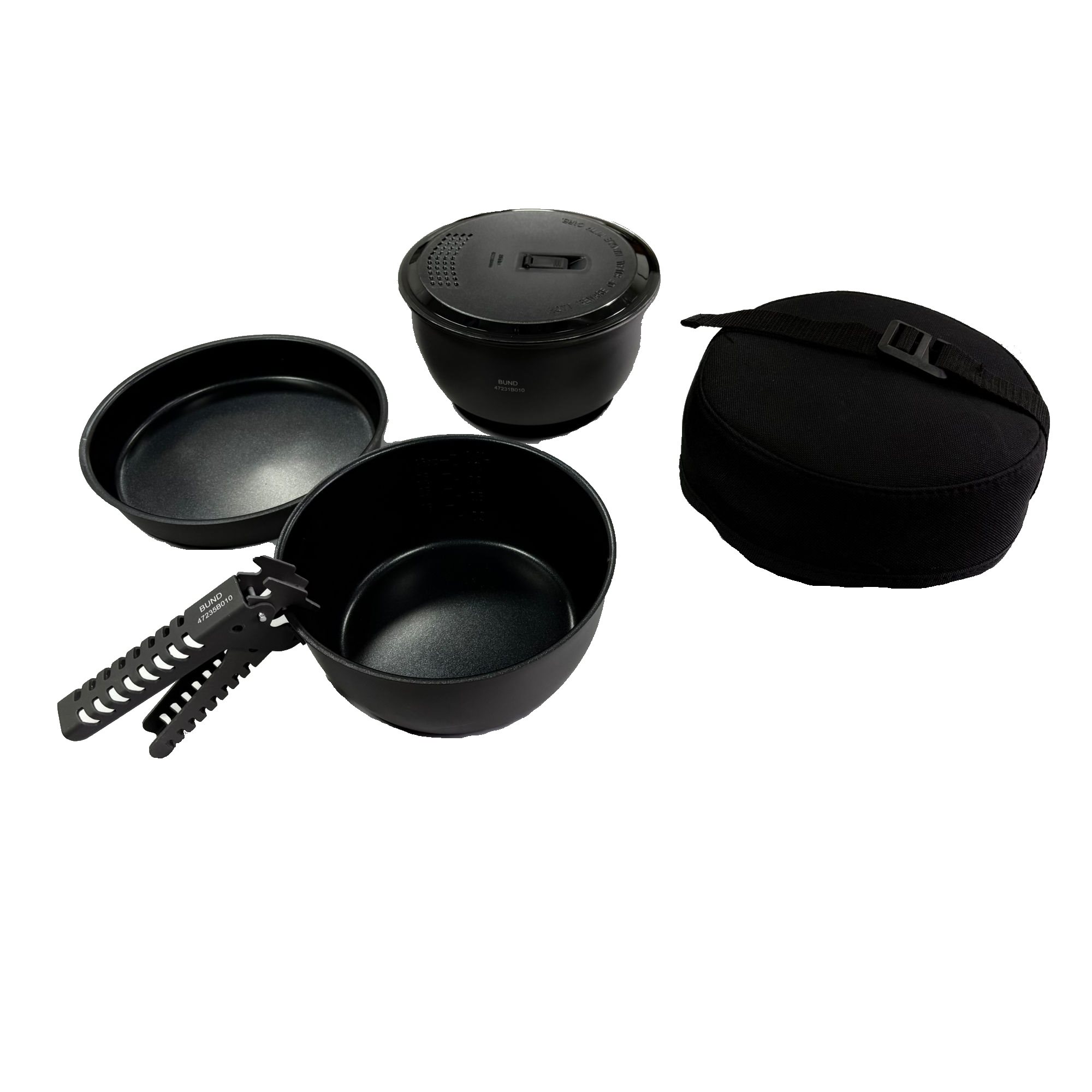Package contents: 1.0 litre pot without handle and lid, 2.5 litre kettle without handle, 20 cm diameter plate, tongs, packing strap with metal buckle. More info