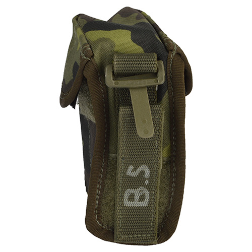 High-quality double holster in Czech Army camouflage pattern from Czech manufacturer SPM Liberec. Originally designed for the modular carrying system (MNS-2000). The holster can also be used for a knife, torch, etc. Thanks to the variably adjustable mount, it can be easily attached to a belt, tactical vest, belt or rucksack. The stitching is made with multiple stitches. Closes with a UH snap fastener, which allows one-handed opening.