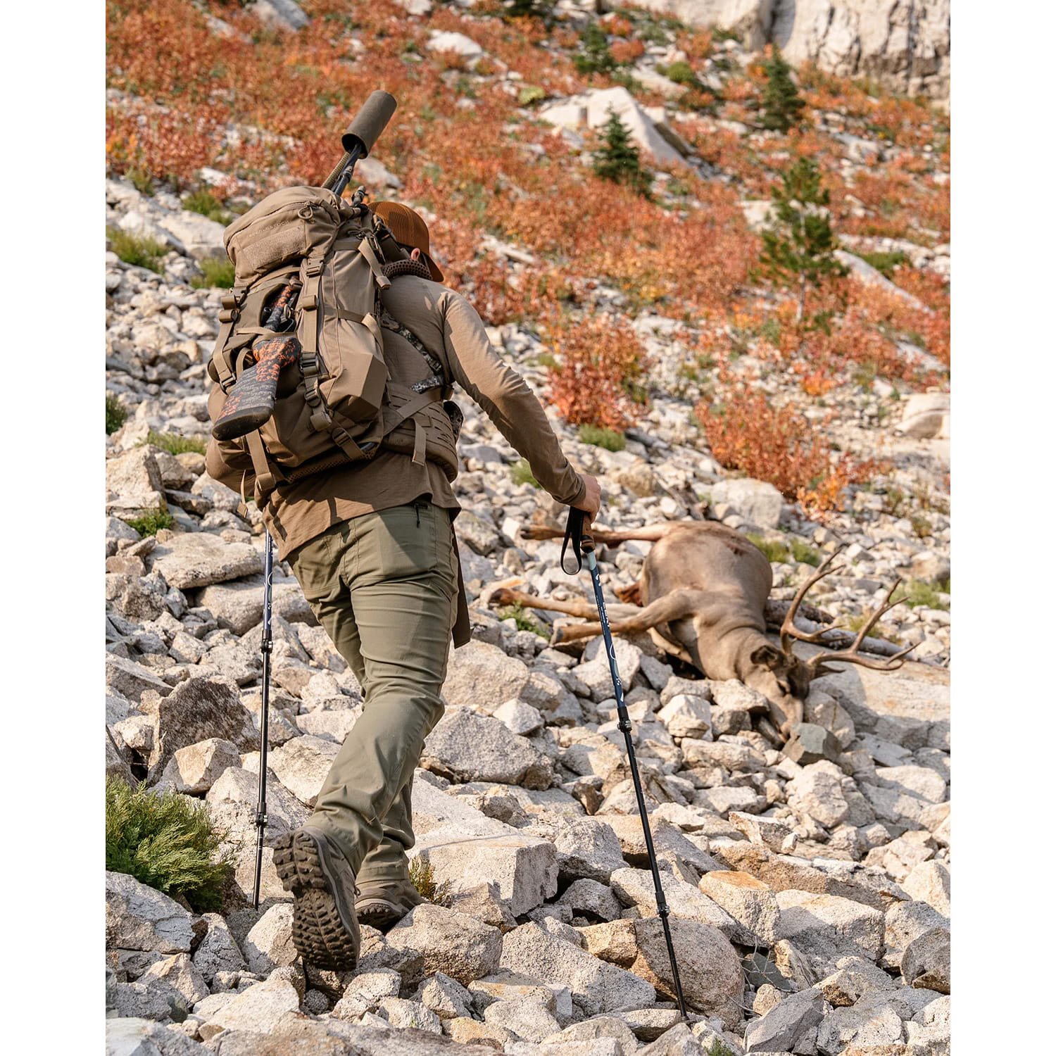 The aluminium carrying system is shaped for maximum back support. If necessary, the rucksack can be removed entirely and the back system can be used separately or in combination with other compatible accessories from the EMOD HUNT product range by EBERLESTOCK. The shoulder straps are equipped with stabilising stops, an elastic chest strap and can be adjusted in height according to the user's needs. The hip belt has a really thick silicone-covered pad that prevents the rucksack from slipping during dynamic movement. The sides of the hip belt are also heavily padded and fasten with a sturdy plastic buckle.