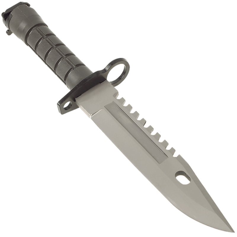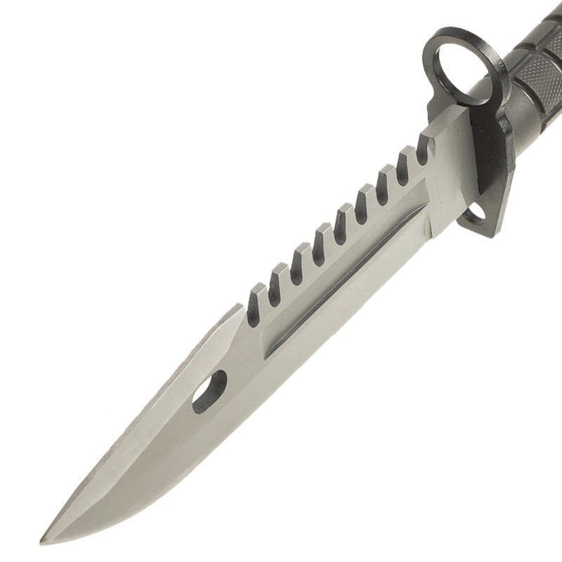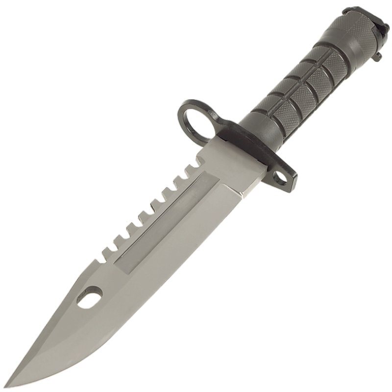A robust bayonet manufactured according to the classic design that entered service with the US Army in 1986. Like the original, this knife features a robust construction suitable for a wide range of tasks. The blade, with a smooth cutting edge, is made from tough 420 stainless steel; on its spine you will find a saw, and at the front there is a hole which, in combination with the sheath, serves to cut wire. The metal guard not only secures the knife to the assault rifle but also protects the hand whilst working. The handle is made of hardened plastic with a non-slip texture, ensuring a firm grip in all conditions. The knife comes with a sturdy belt pouch featuring a sturdy plastic buckle.