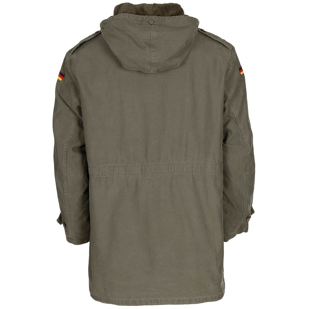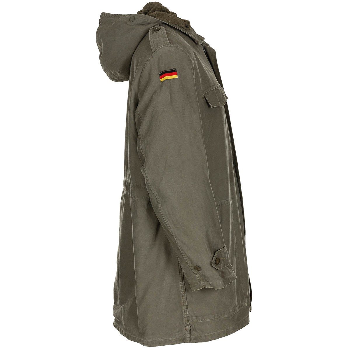 High-quality green parka from the German Bundeswehr. Removable winter lining. Zip fastening covered by a flap with buttons. Four flap pockets with button fastenings. Drawstring in the hood and at the bottom hem of the jacket. Adjustable waist.