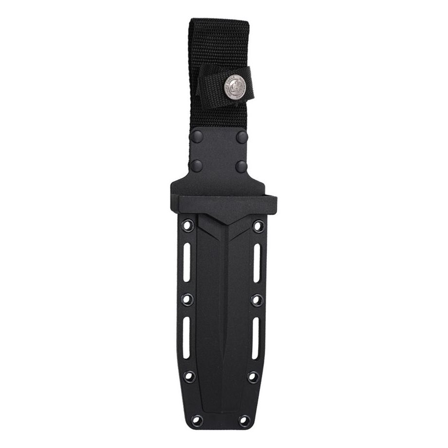Full-tang knife with a fixed dagger-shaped blade. The blade with a smooth double-sided edge is made of 3Cr13MoV stainless steel with a fine satin finish. The handle is shaped to fit comfortably in the hand and its scales are made of black nylon. At the end of the handle, there is a hole for threading a lanyard. The knife comes with a plastic belt sheath with a snap fastener.