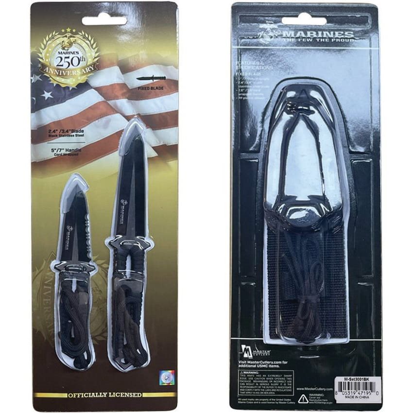 Set of two daggers with paracord-wrapped handles. The larger knife has a smooth blade, while the smaller one has a combination blade. The knives are made of 3Cr13MoV stainless steel. The knives come with a nylon sheath with a safety cord.