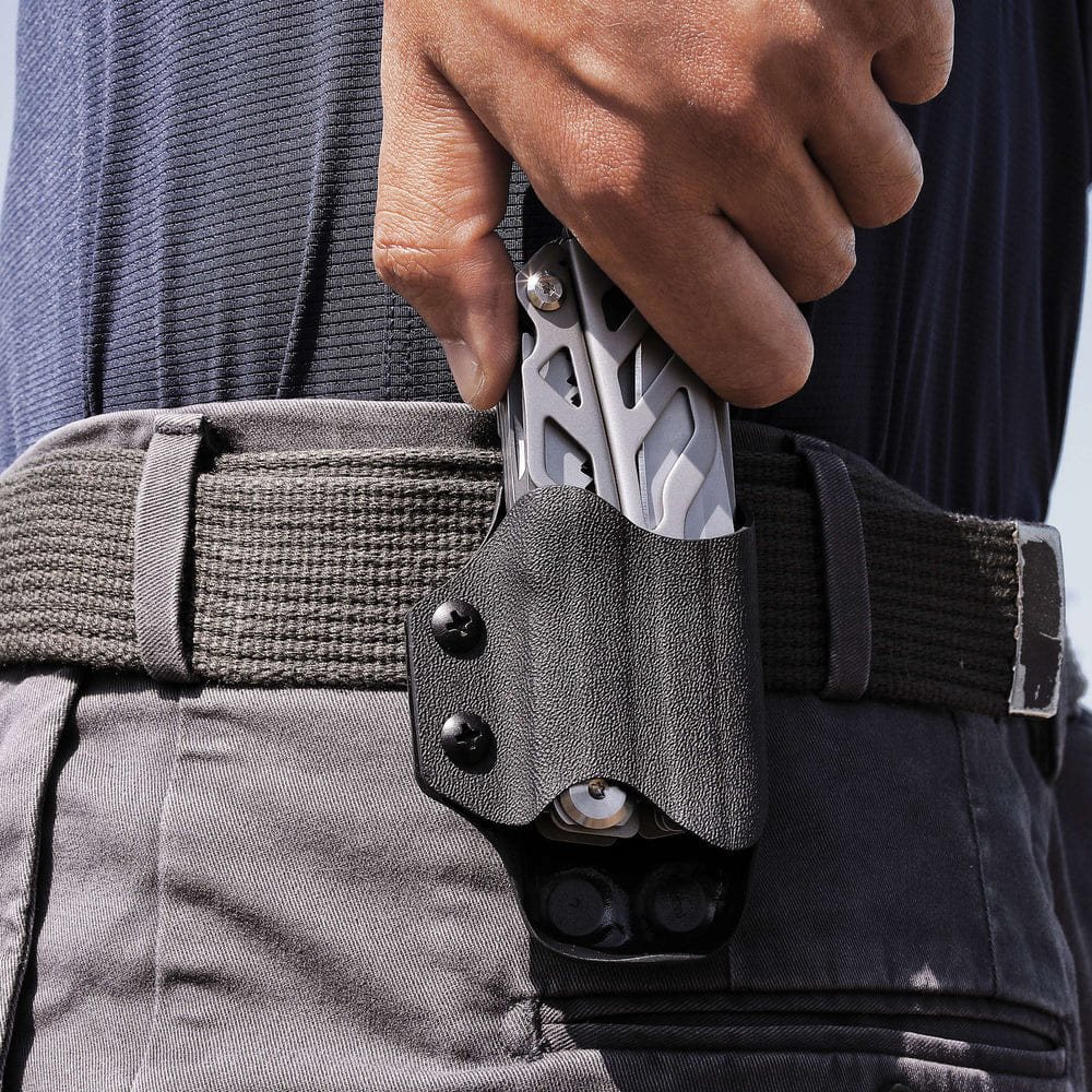 Kydex belt holster designed for FLAGSHIP PRO multi-purpose pliers from NEXTOOL. The holster is made of 1.5 mm thick thermoplastic, which is characterised by a high level of durability. The pressure of the holster can be adjusted by tightening or loosening the side screws.