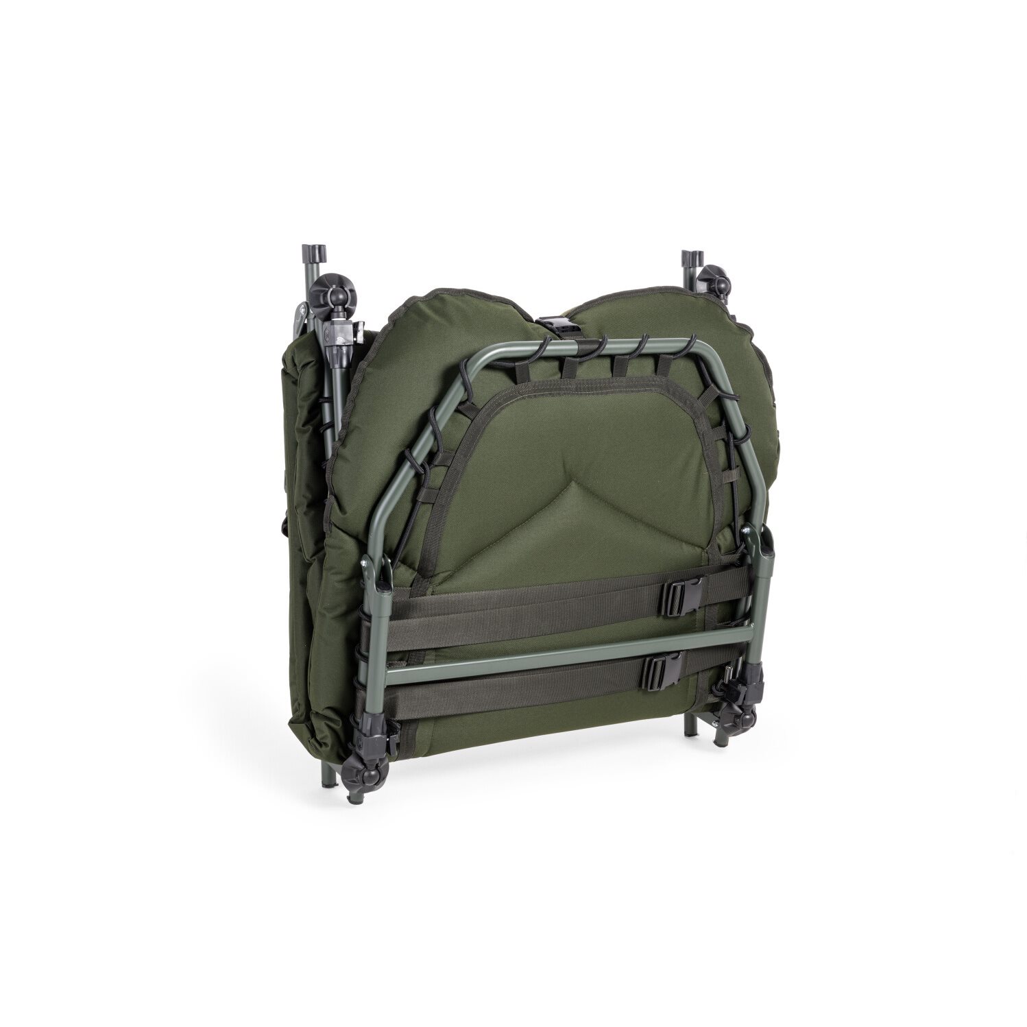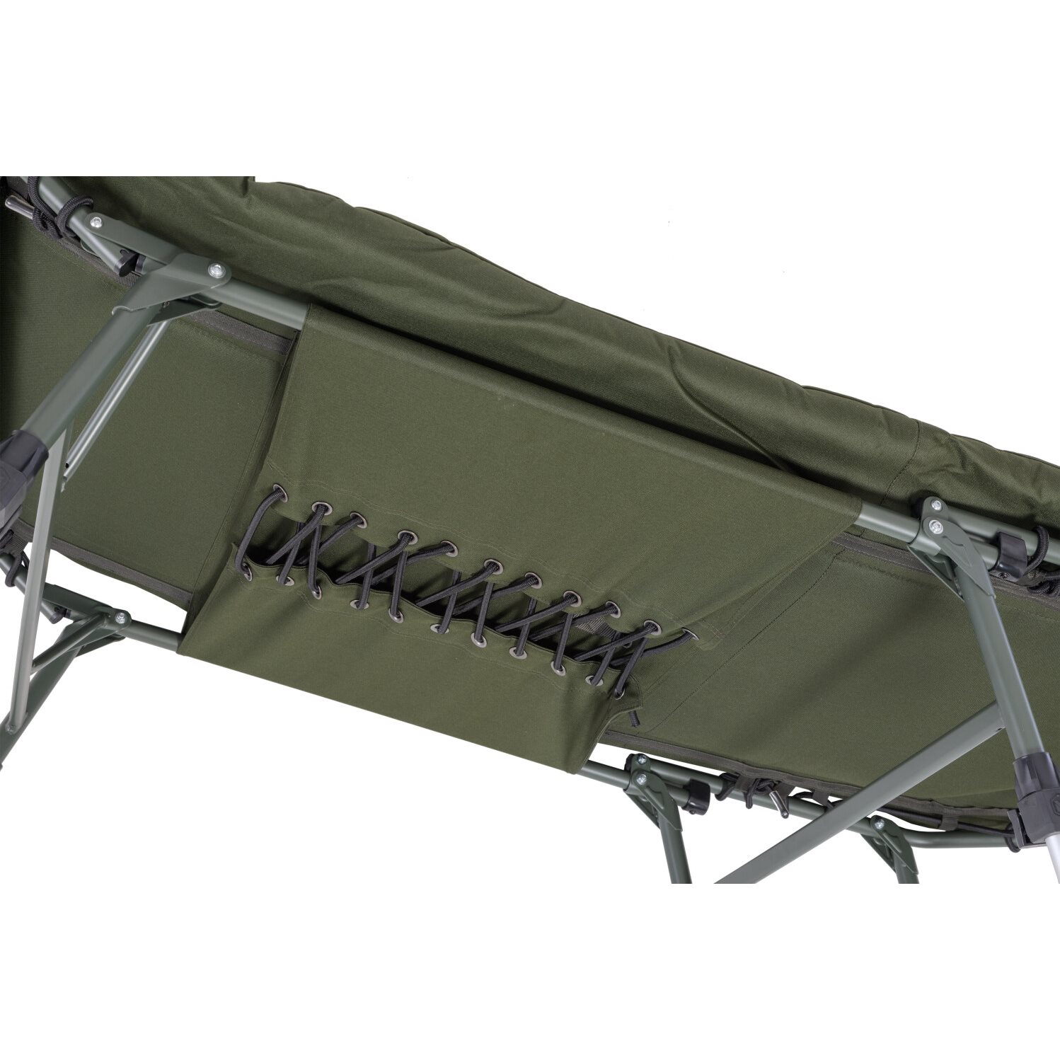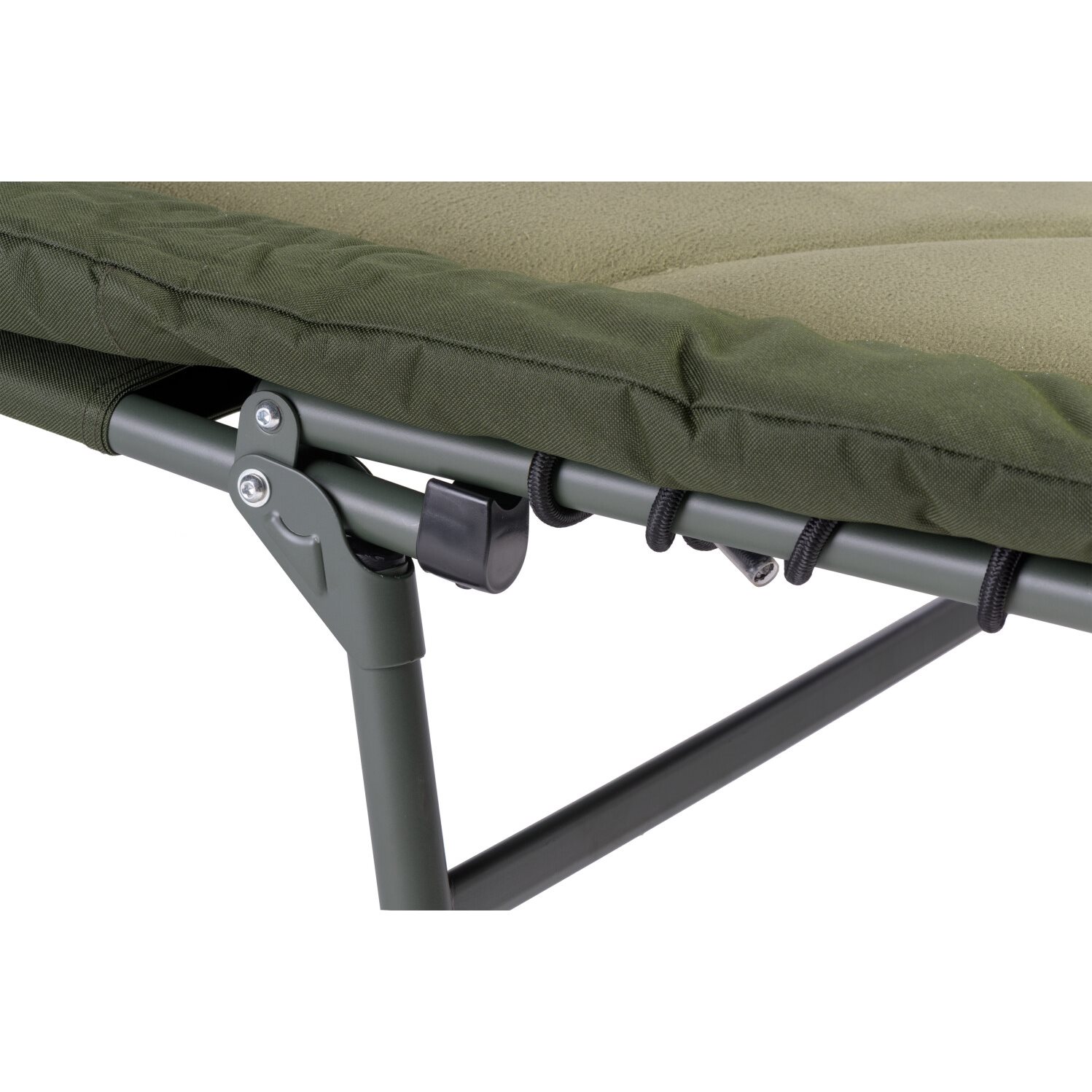 A large eight-legged bedchair with a completely new, unique design. The newly designed, enlarged mattress is equipped with a new type of padding with greater thickness. Its attractive anatomical shape combines elements of Mivardi's new design language with important details to enhance overall ergonomics. Combined with a sophisticated system of independent mattress firmness adjustment in the lower, middle and upper sections, this new bedchair offers unrivalled comfort in its category. The bedchair cover uses a combination of very comfortable and warm fleece on the cushion in the middle section with highly durable nylon on the edges and bottom. The telescopic legs with swivel feet to prevent sinking are fitted with unique Mivardi extension locks, which can be operated by pressing down or from the side.