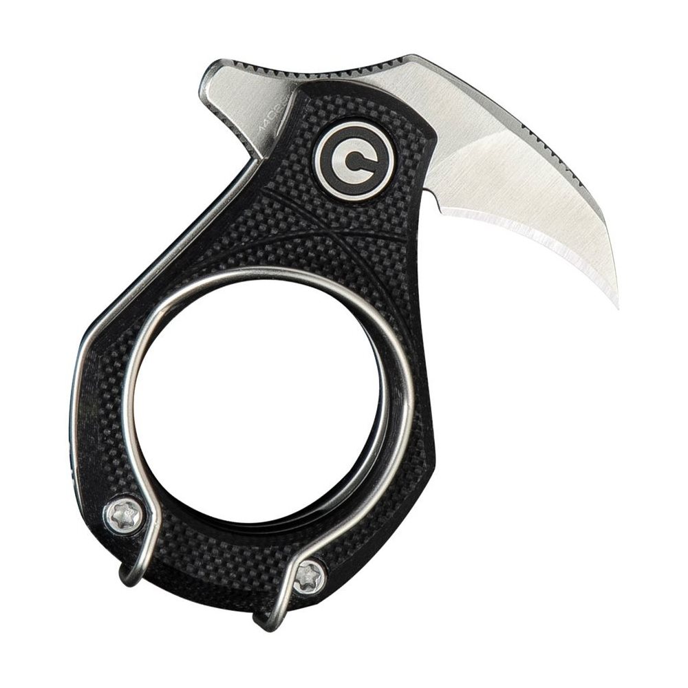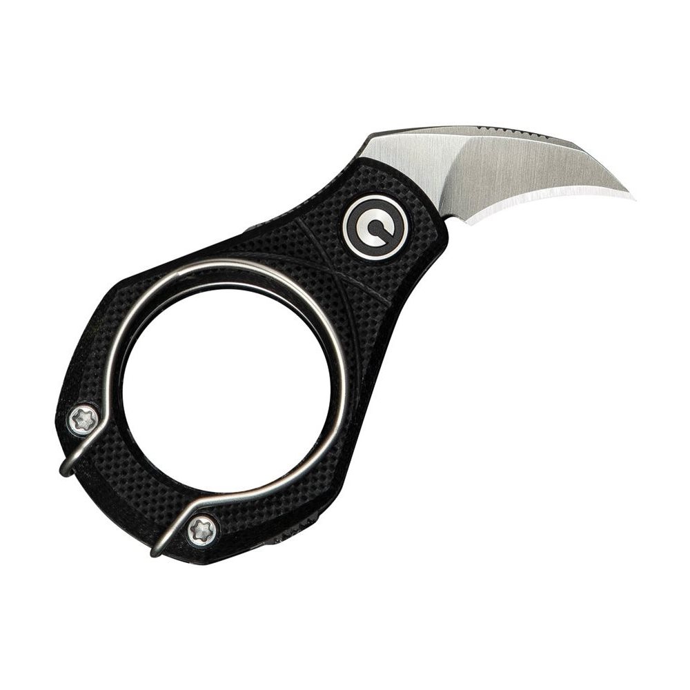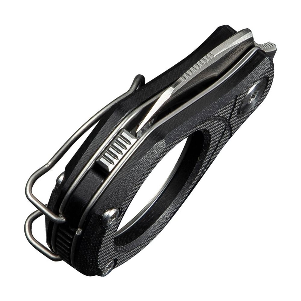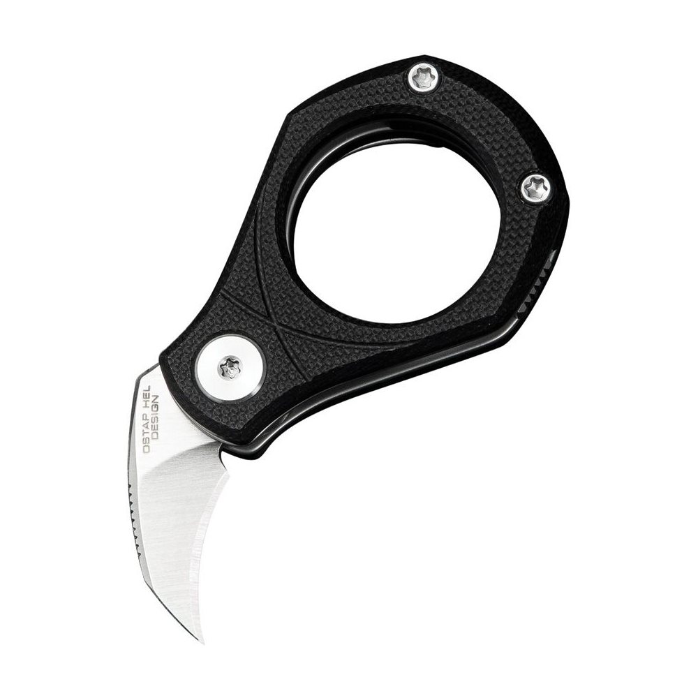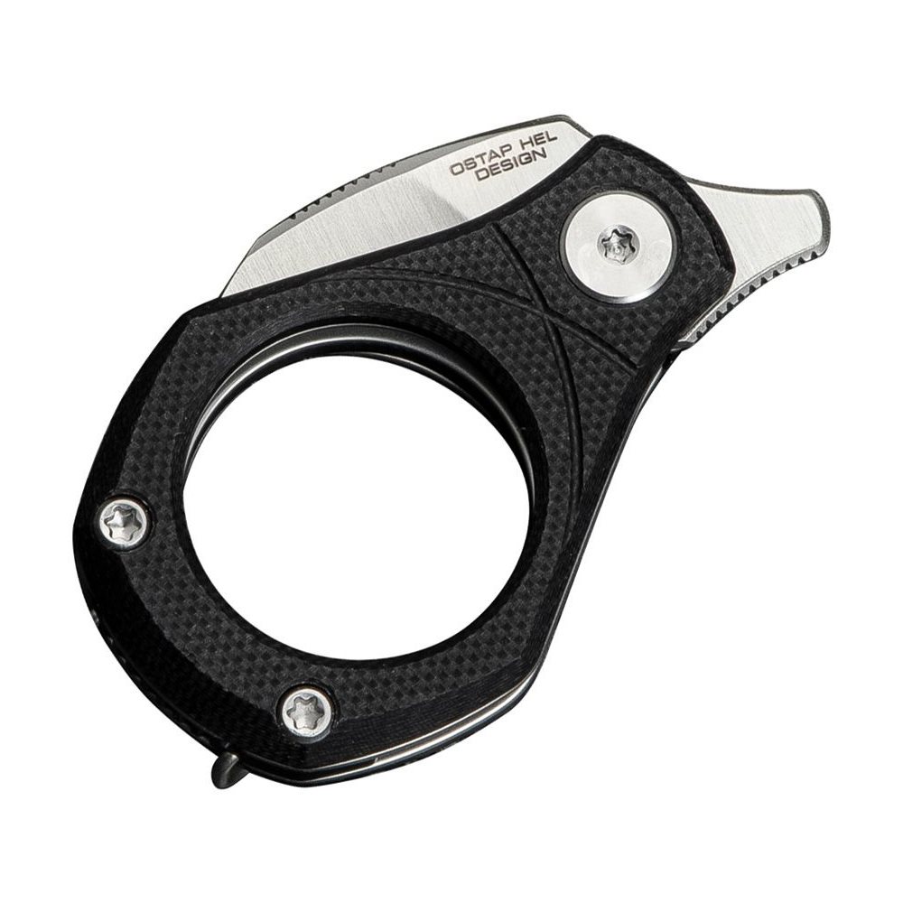 A minimalist "keyring" knife designed by knife maker Ostap Hel. Thanks to its size, the knife is ideal for EDC carry. The blade of the knife with a smooth edge is made of Swedish Sandvik 14C28N stainless steel and is approximately 16 mm long. A ceramic ball bearing ensures smooth operation of the knife. The G10 handle is pear-shaped with a distinctive centre hole for the finger, its surface has a non-slip texture and there is a metal pocket clip on one side. Despite its compact dimensions, the knife has a reliable Slip Joint safety lock.