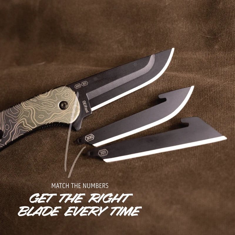 4.25" (10.8cm) closed. 3" (7.62cm) blade. Green aluminum handle. Extended tang. Pocket clip. Black 420J2 stainless blade holder. Comes with three replaceable 420J2 stainless drop point blades (2 standard; 1 serrated). Topo pattern on handle.