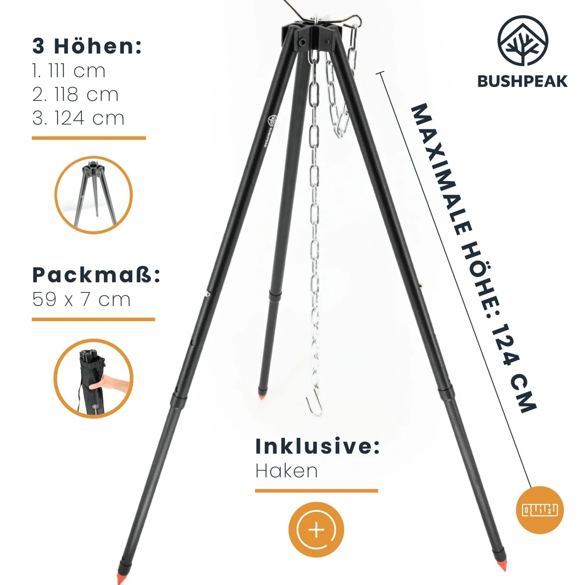 The tripod allows you to hang a pot, mess tin or grill rack over the fire and conveniently adjust the height according to the intensity of the heat. Its simple assembly and disassembly make it a practical companion for scouts, bushcrafters, fishermen and family trips.