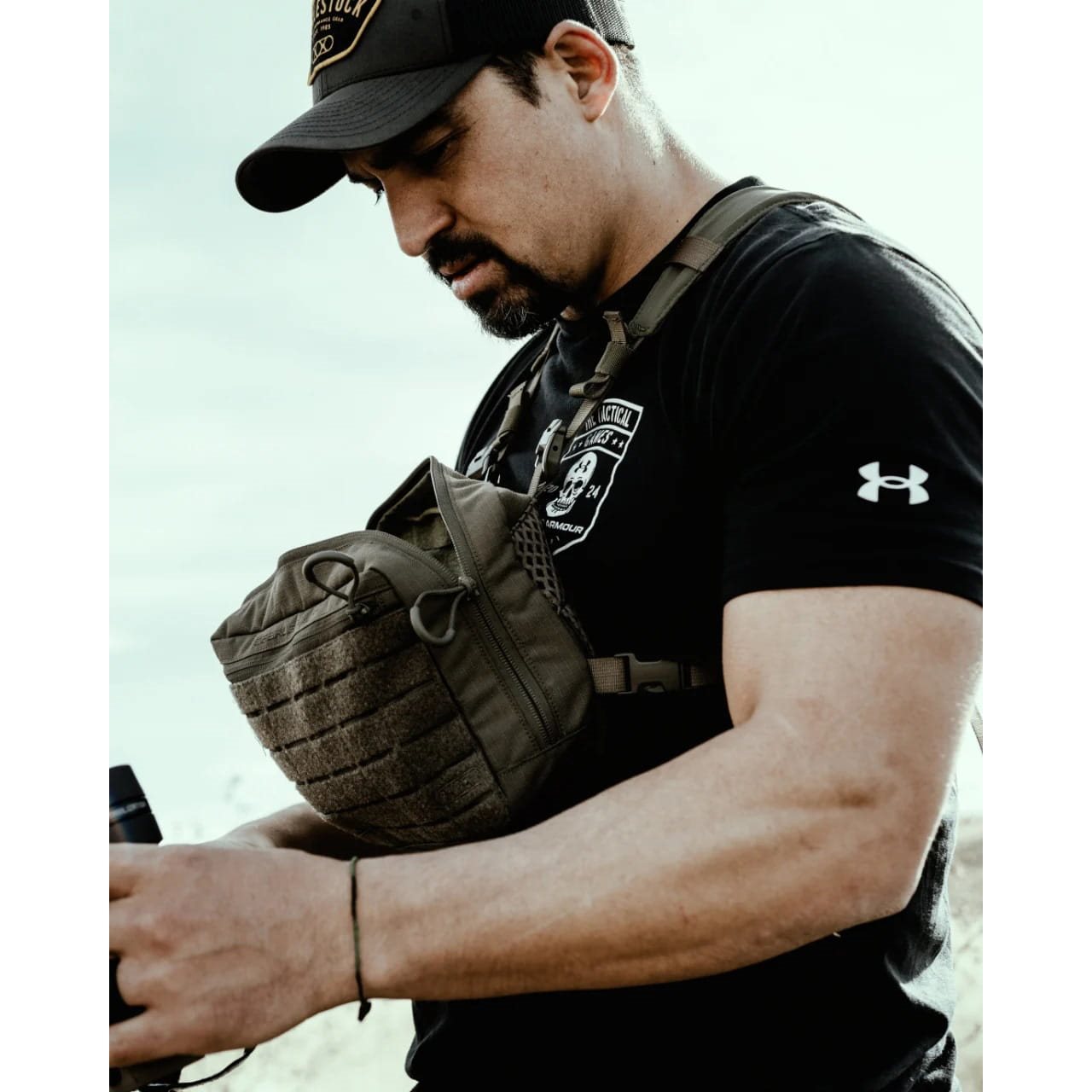 Modular chest bag suitable for civilian and tactical use. Its design is based on the Recon and Bravo chest holsters for binoculars. The Force chest pocket offers a larger single-compartment design without side "wings" for accessories. Equipment can be stored in the main compartment, accessible via a two-way zip, or in the front flat zip pocket. The main compartment has an internal flat zip pocket, three open compartments and a rear VELCRO panel with a cut-out binding for attaching a holster for a short firearm or pouches for small items.