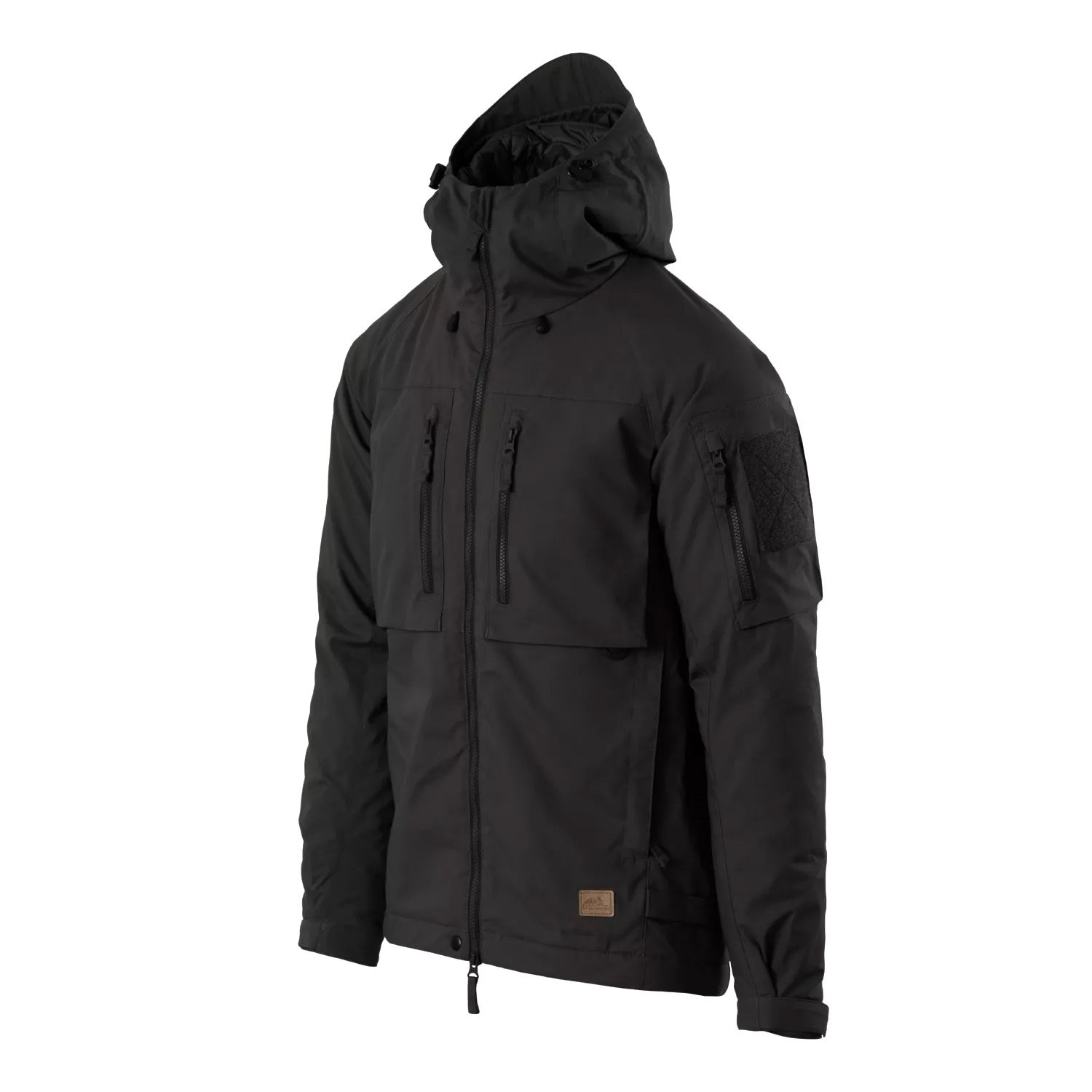 All zips on the jacket are high-quality YKK zips, and the jacket fastens with a central two-way zip complemented by a press stud at the waist. The jacket also has mesh ventilation under the arms. The hood is easily adjustable with an elastic drawstring with a stopper, and the three-point adjustment allows it to fit any head perfectly. The jacket has a total of eight pockets for storing valuables and small items. The chest pockets have an internal organiser and are closed with zips. Under these pockets, you will find a pair of hand pockets lined with warm fleece. On the left shoulder, there is a large pocket with an external VELCRO panel for personalisation with patches. The remaining three pockets (two of which are mesh) are inside the jacket and are large enough to be accessible even when wearing gloves. Below the chest pockets are paracord loops for attaching a compass or other small items. At the ends of the sleeves are Velcro cuffs for individual adjustment. The waist can be tightened using elastic cords with stoppers to prevent unwanted wind penetration. On the sides of the jacket, you will find several MOLLE/PALS standard modular webbing slots.