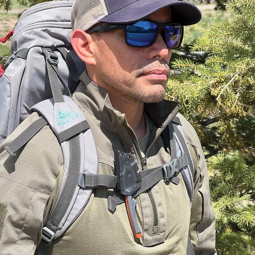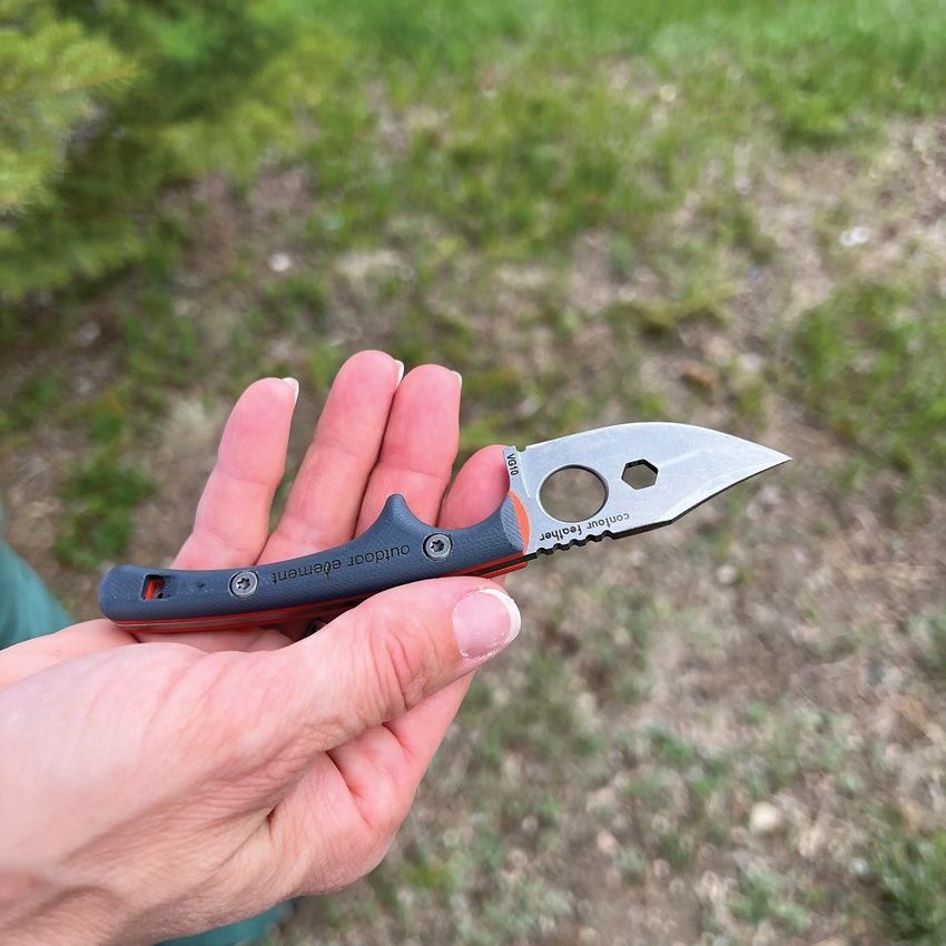 Full-tang knife with a fixed blade and an unusually thin handle. The blade with a smooth edge is made of high-quality VG-10 steel with a stonewash finish. In the middle of the blade, you will find a hexagonal hole and a larger hole for your finger. The two-colour handle is made of robust G10 material, and the shape of the handle is designed for maximum grip in any situation. The knife comes with a plastic sheath with an integrated fire starter, sharpener and whistle.