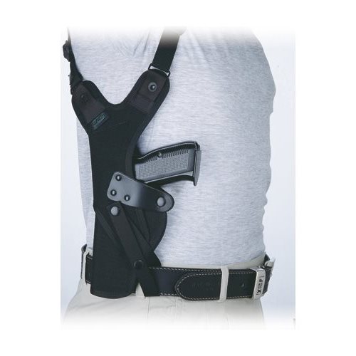 Single-sided left-handed underarm flip-up holster with cross suspension suitable for P-07, GLOCK 17, Walther P99, SIG P226/228, H&K USP firearms.