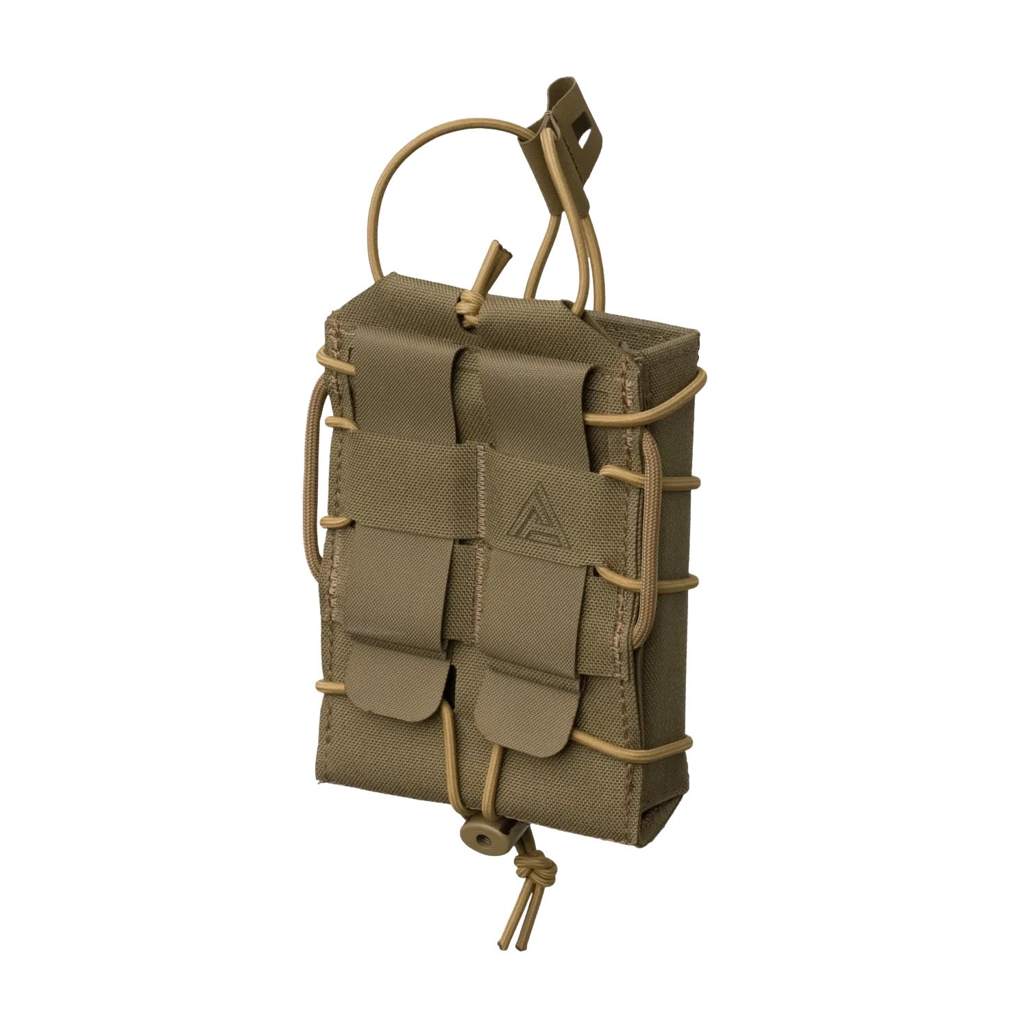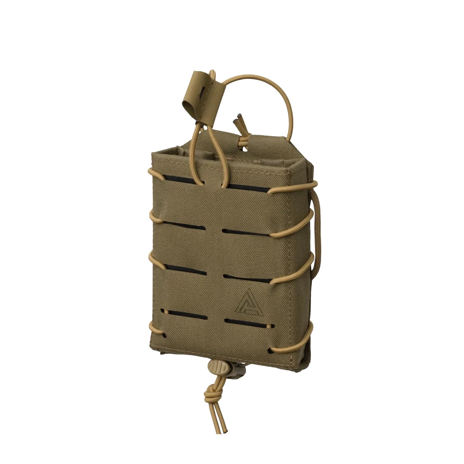 An open pouch designed for quick magazine changes while ensuring fully secure content transportation. It is intended for carrying .308WIN magazines, including their wider versions for the HK system. An internal Hypalon® patch, rigid structure, adjustable pouch circumference, and elastic bungee cord holders at the top prevent magazines from falling out. The pouch's rigidity allows for easy one-handed magazine insertion. It is compatible with the MOLLE/PALS system, and thanks to specially designed paracord loops, it can also be mounted on any gun belt up to 45 mm wide. The laser-cut modular system, compatible with MOLLE/PALS, placed on the front of the pouch, allows for stacking pouches on top of each other.
