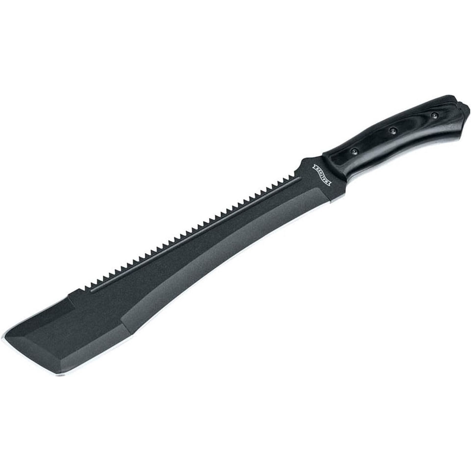 Powder-coated carbon steel, excellent cutting and chopping performance, sharp serrated sawback, includes durable nylon sheath.