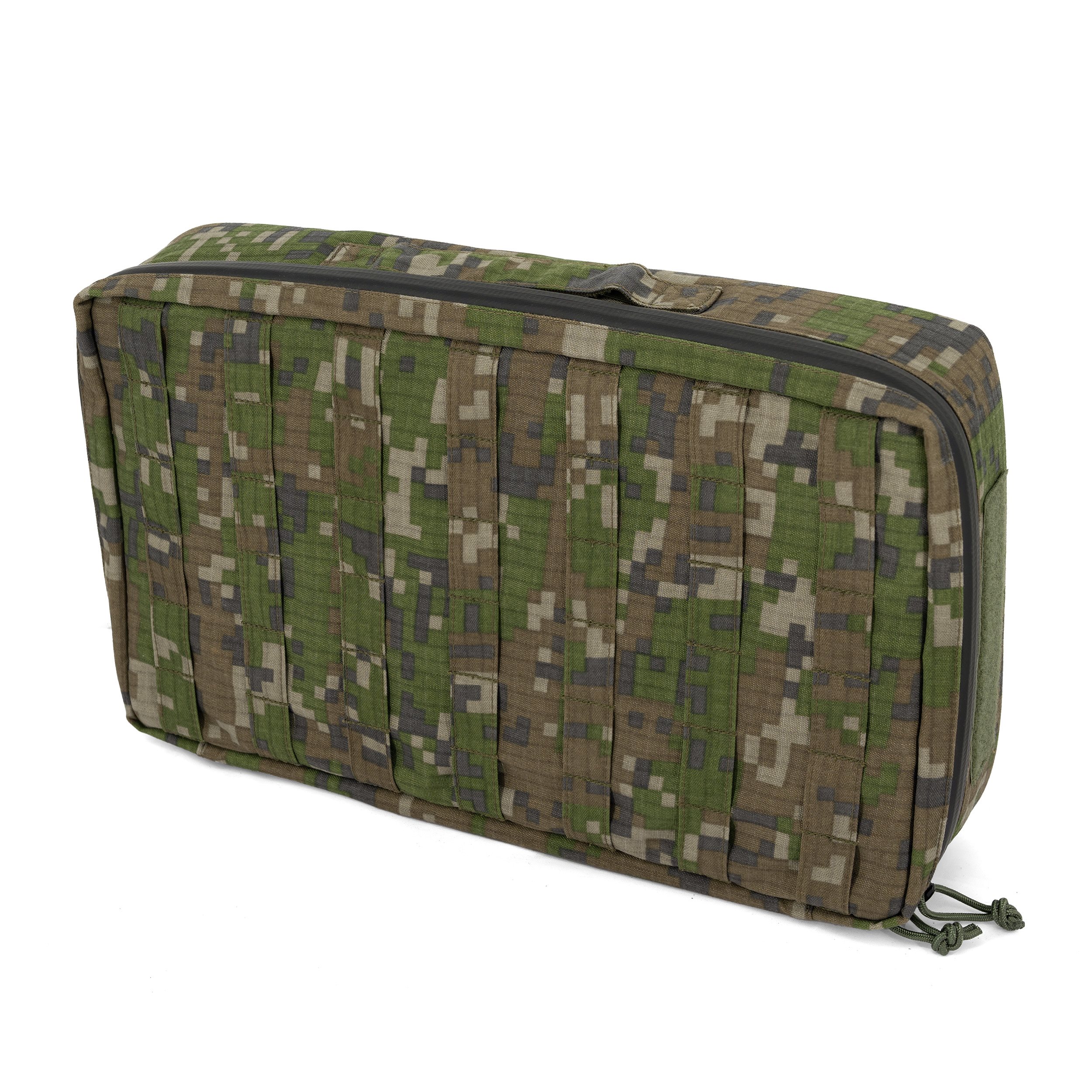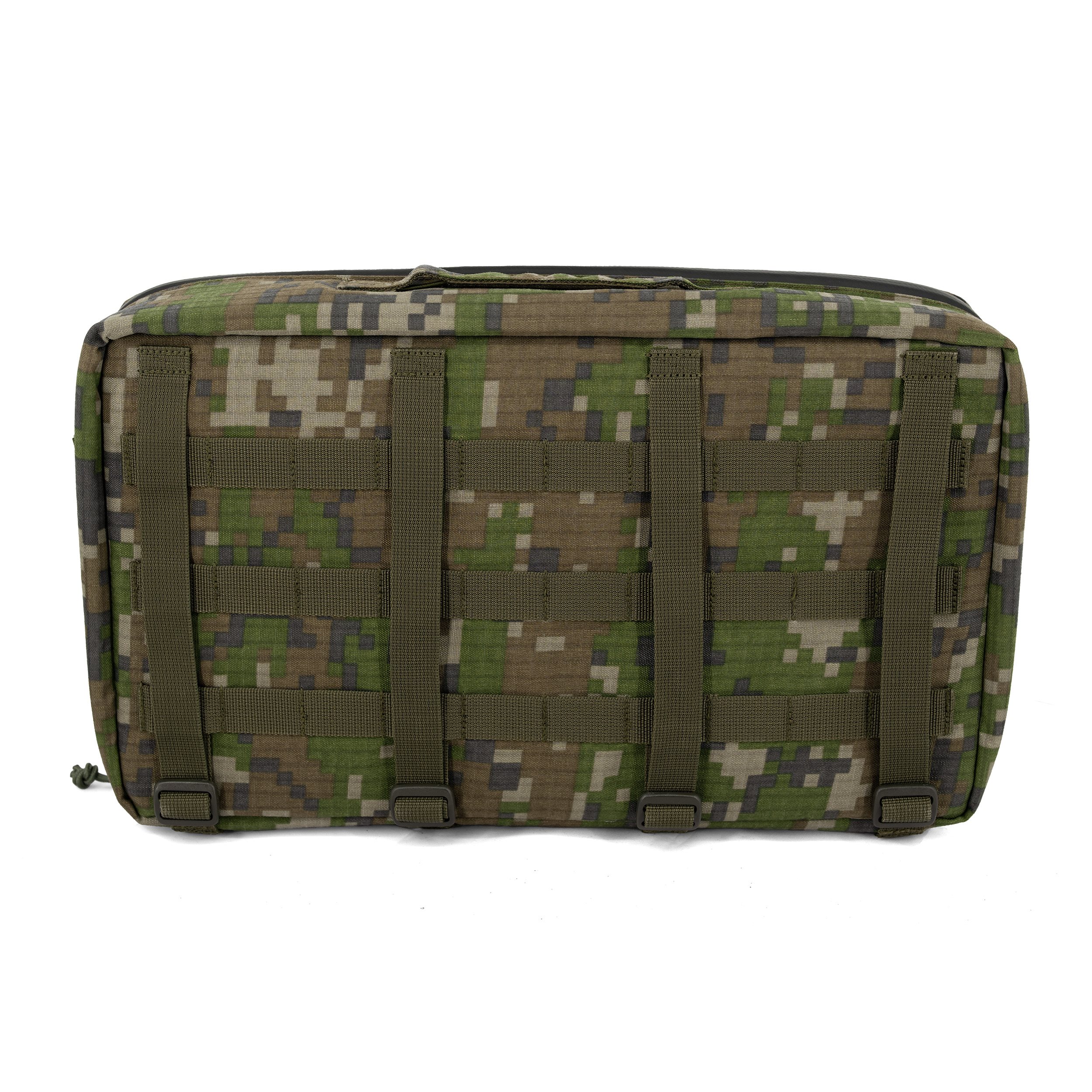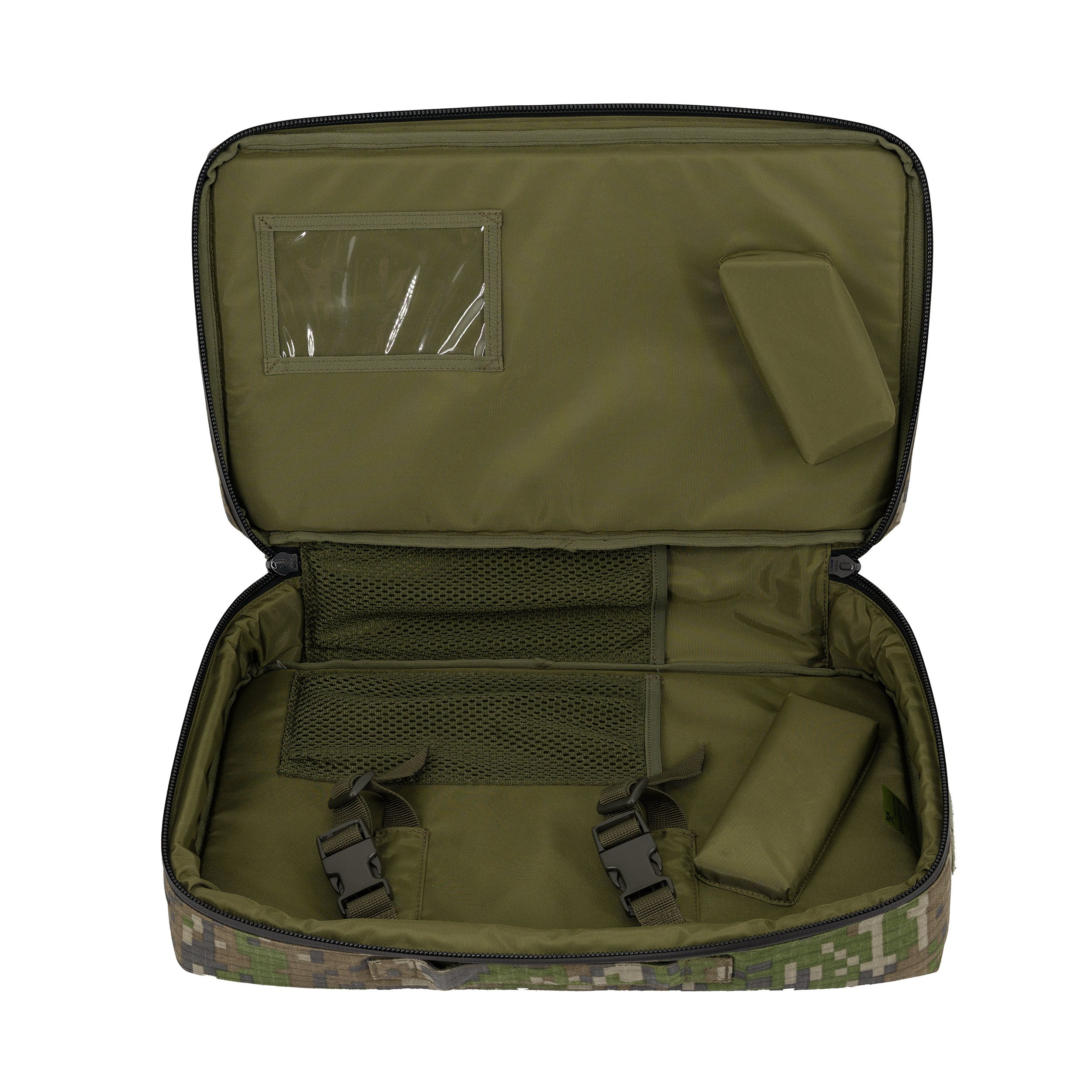 The case closes with a two-way waterproof zip and allows the front to be opened. A pair of adjustable straps with Fastex buckles and a padded "stop" inside the case are used to secure the equipment being carried. Two elongated mesh compartments are used to store batteries or other accessories. A mica window allows you to store items such as a manual. On the outer perimeter of the case, there is a simple carrying handle (longer side) and Velcro panels (shorter sides) for attaching VELCRO patches. Four vertical straps and thread-through buckles are used to attach it to a vest, backpack or other platform.