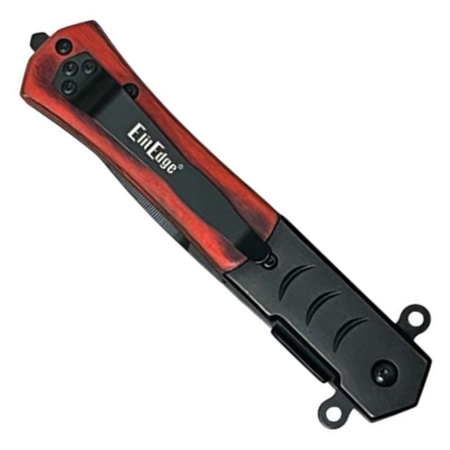 Assisted opening. 5.25" (13.34cm) closed. 4" (10.16cm) black titanium coated false edge 420C stainless blade. Brown pakkawood handle. Stainless bolster(s). Extended tang. Pocket clip. Glass breaker.