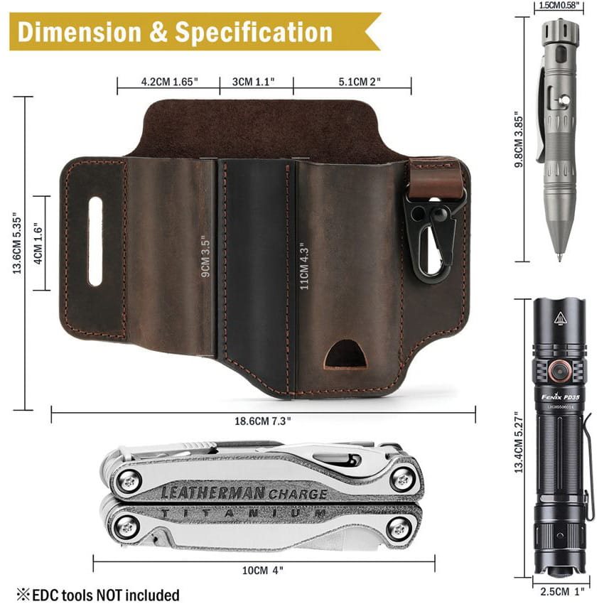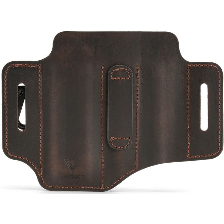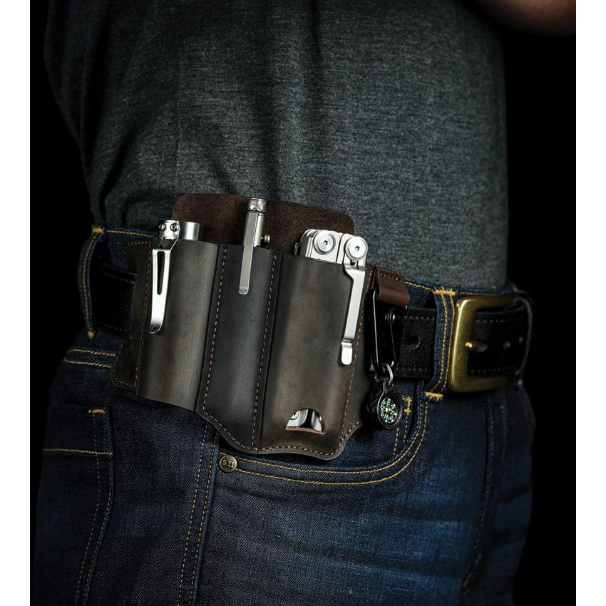 A practical belt pouch designed for carrying a multitool, tactical pen, torch, etc. The torch compartment has no bottom, so even larger torches can be stored without any problems. In contrast, the pen compartment has a closed bottom and can hold writing instruments up to 9.8 cm in length. The main compartment for the multitool has a bottom opening for easier removal of tools from the holster. The metal clip can be used for keys, for example. The holster is suitable for belts up to 4 cm wide. Soft yet durable leather was used to make the holster.