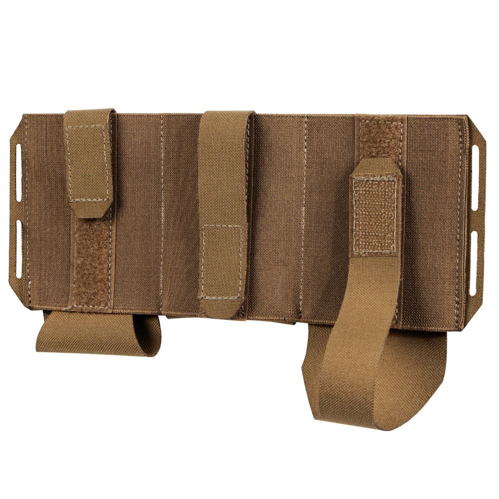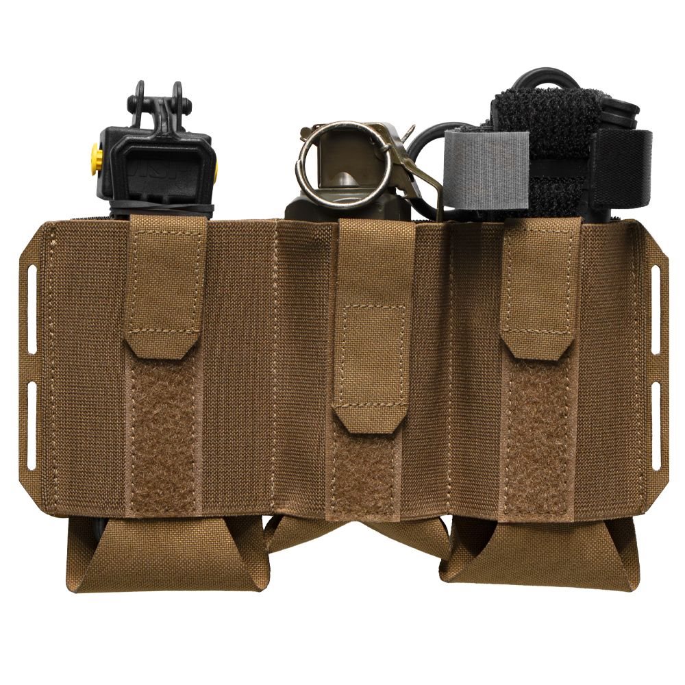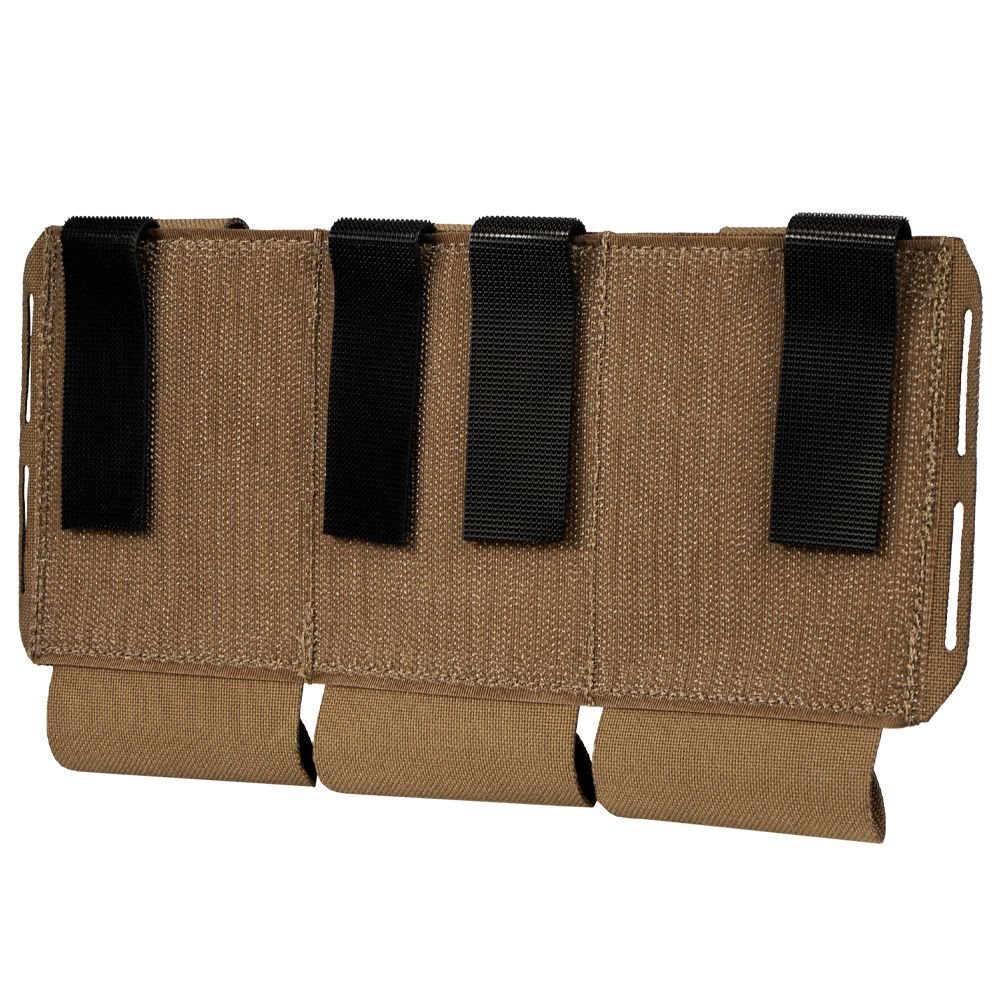 Open triple pouch designed for the Vanquish Armour System (VAS). It is made of durable laminate combined with elastic material, which reduces the profile of the pouch when not in use. Thanks to its adjustable height, the pouch can hold M4/AR magazines of various capacities or other equipment you need to have at hand. The side loops can be used to hang additional equipment. The back of the pouch is equipped with Velcro for convenient and quick attachment.