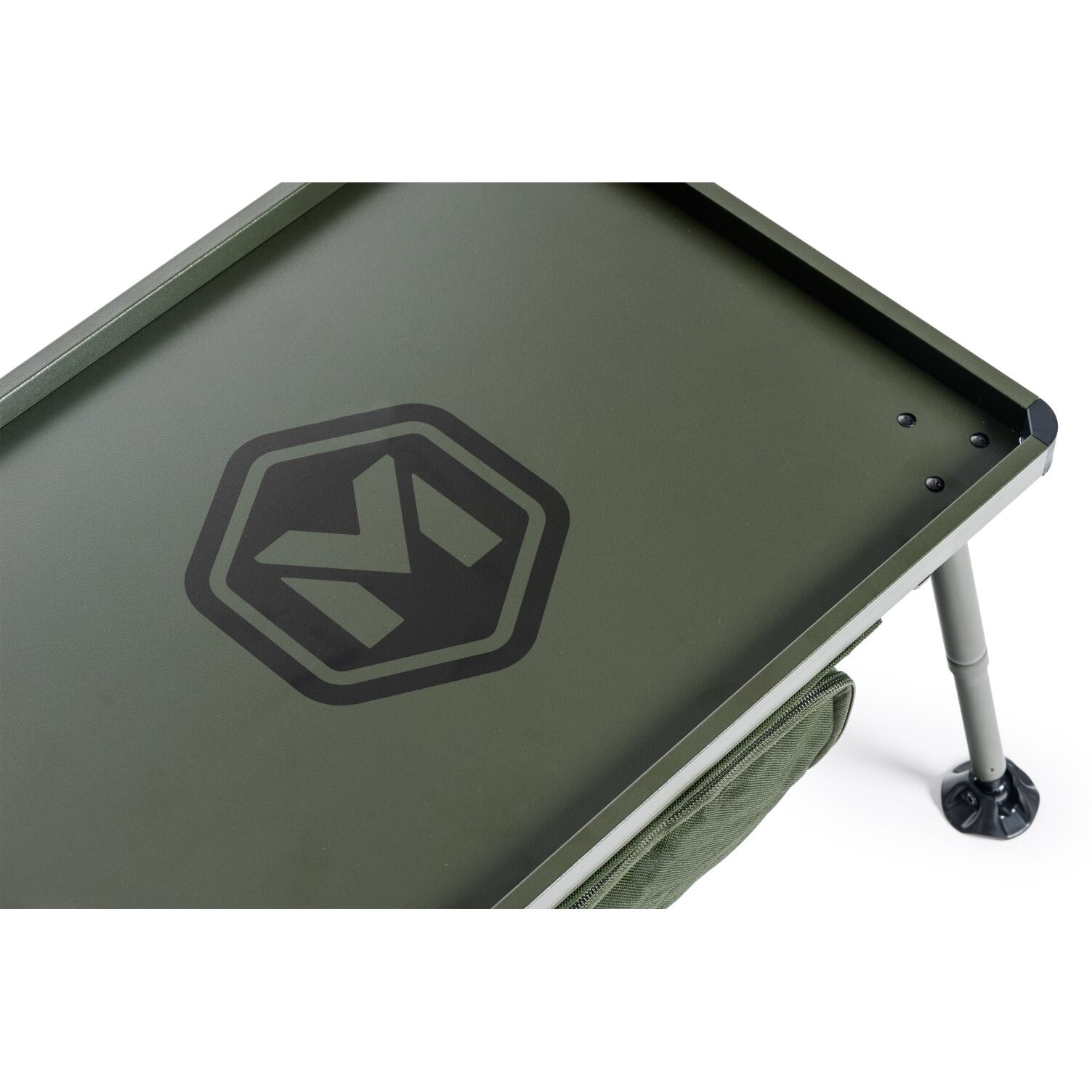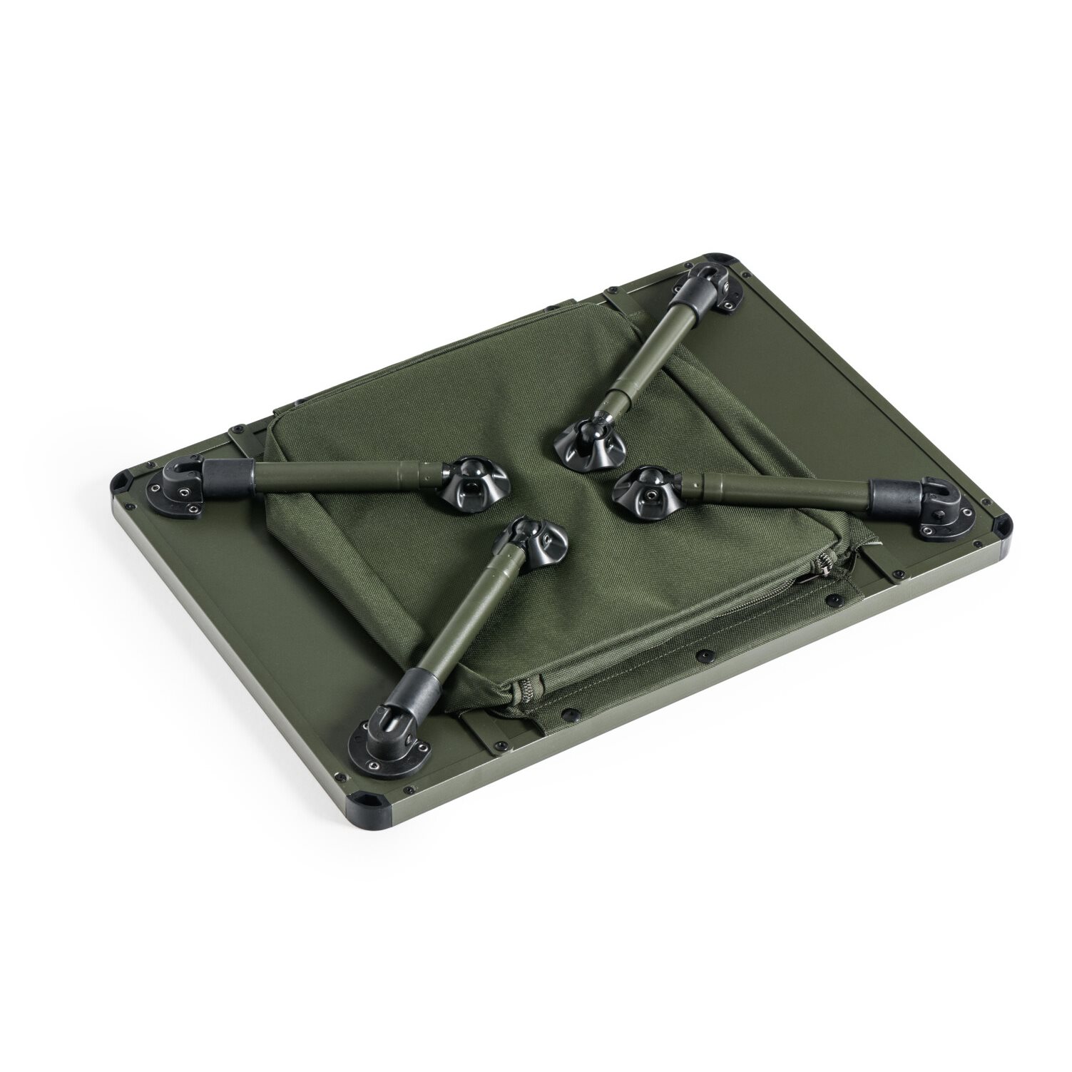 A newly designed larger bivvy table with storage space under the tabletop. The storage space can be closed with a zip and its bottom is reinforced with a lightweight but sufficiently rigid board. The all-metal construction of the main tabletop guarantees rigidity and long service life. The telescopic legs are equipped with luxury swivel feet and a quick-lock extension system. They also allow the table to be set at an above-standard height. The legs are also very easy to fold and unfold. The table comes in a practical carrying case with handles for transport.
