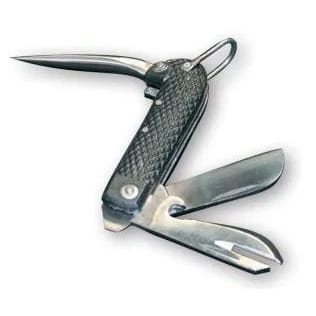 Fitted with single blade, Marlinspike, flathead screwdriver, can opener and steel loop for lanyard.