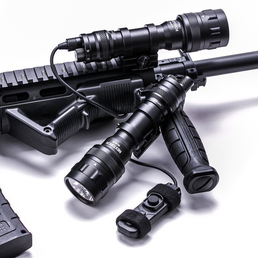 Tactical flashlight for long guns with a maximum output of 1000 lumens and a choice between visible light and IR illumination. A pair of rotary controls on the body of the flashlight allow for quick selection between different lighting modes. The torch has an integrated mount that allows it to be attached to a Picatinny rail without the need for tools. The remote switch with two Velcro straps can be easily attached to the fore-end of the weapon or the front vertical grip. The torch is powered by two CR123 Li-Ion batteries, which are included in the package. Alternatively, a pair of CR123 batteries or a 18650 rechargeable battery can be used.