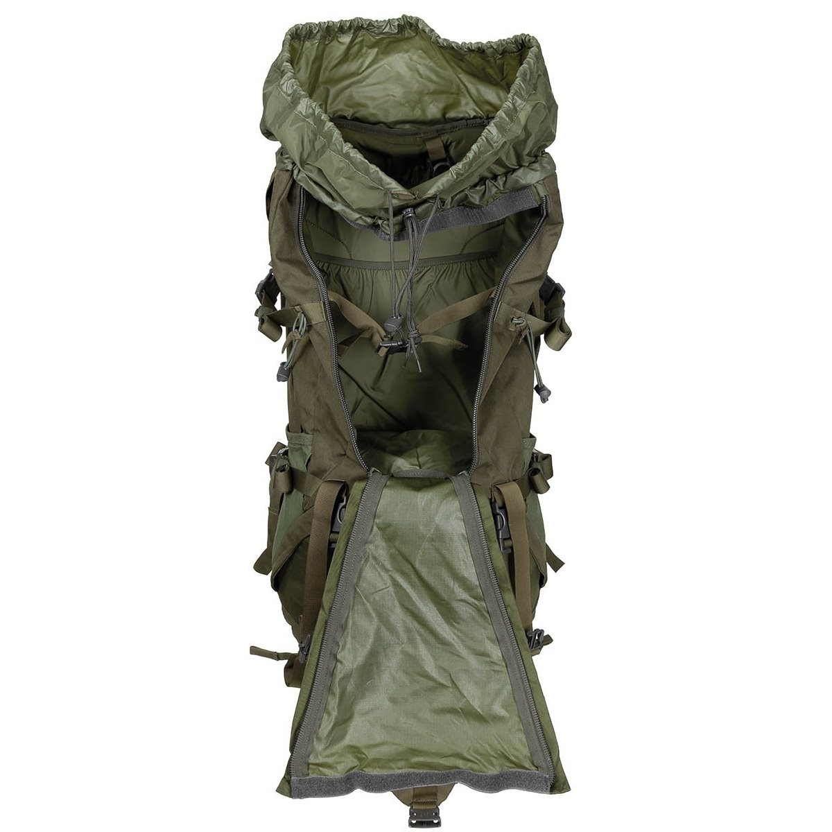 2 elastic side pockets, each with 1 zip pocket above and 2 compression straps