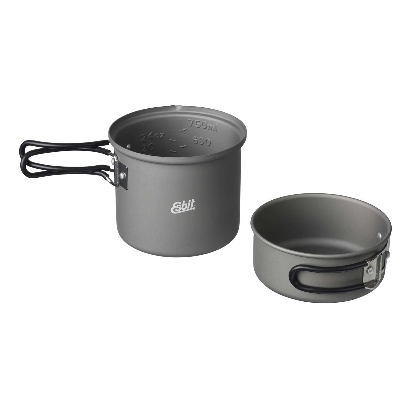 Two-piece pot - a 1-litre pot with a lid that can be used as a separate smaller pot/bowl with a capacity of 475 ml. The larger pot has measurements in ml and oz. Both parts have folding handles. More info