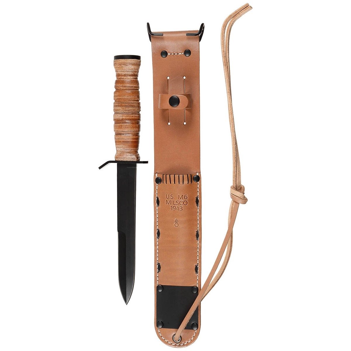 A successful reproduction of the M3 bayonet, including the M6 leather scabbard.
