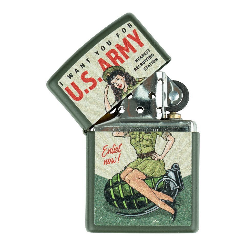 Inspired by classic American wartime enlistment posters. This Zippo combines military pride with iconic pin-up glamour. The illustration of the U.S. Army Enlist Pin-Up symbolizes charm, morale, and vintage Americana.